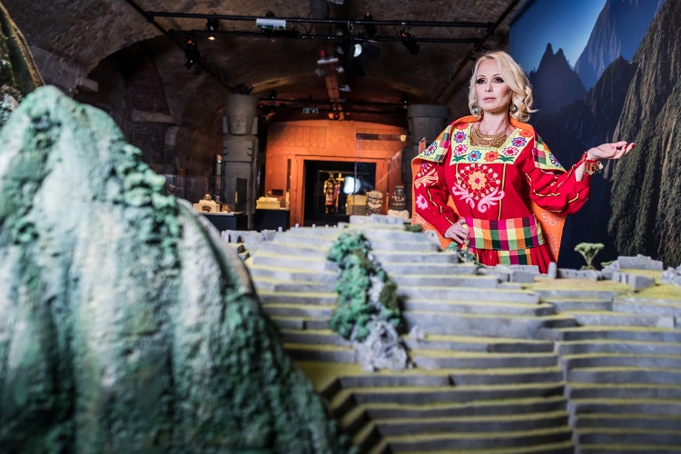 Köllő Babett színpompás, kézzel varrott perui ruhában és értékes ékszerekben állt kamera elé Az Inkák Aranya kiállításon. A nemesfém csillogása valósággal megbabonázta a színésznőt. Bárhova nézett, aranyat látott.